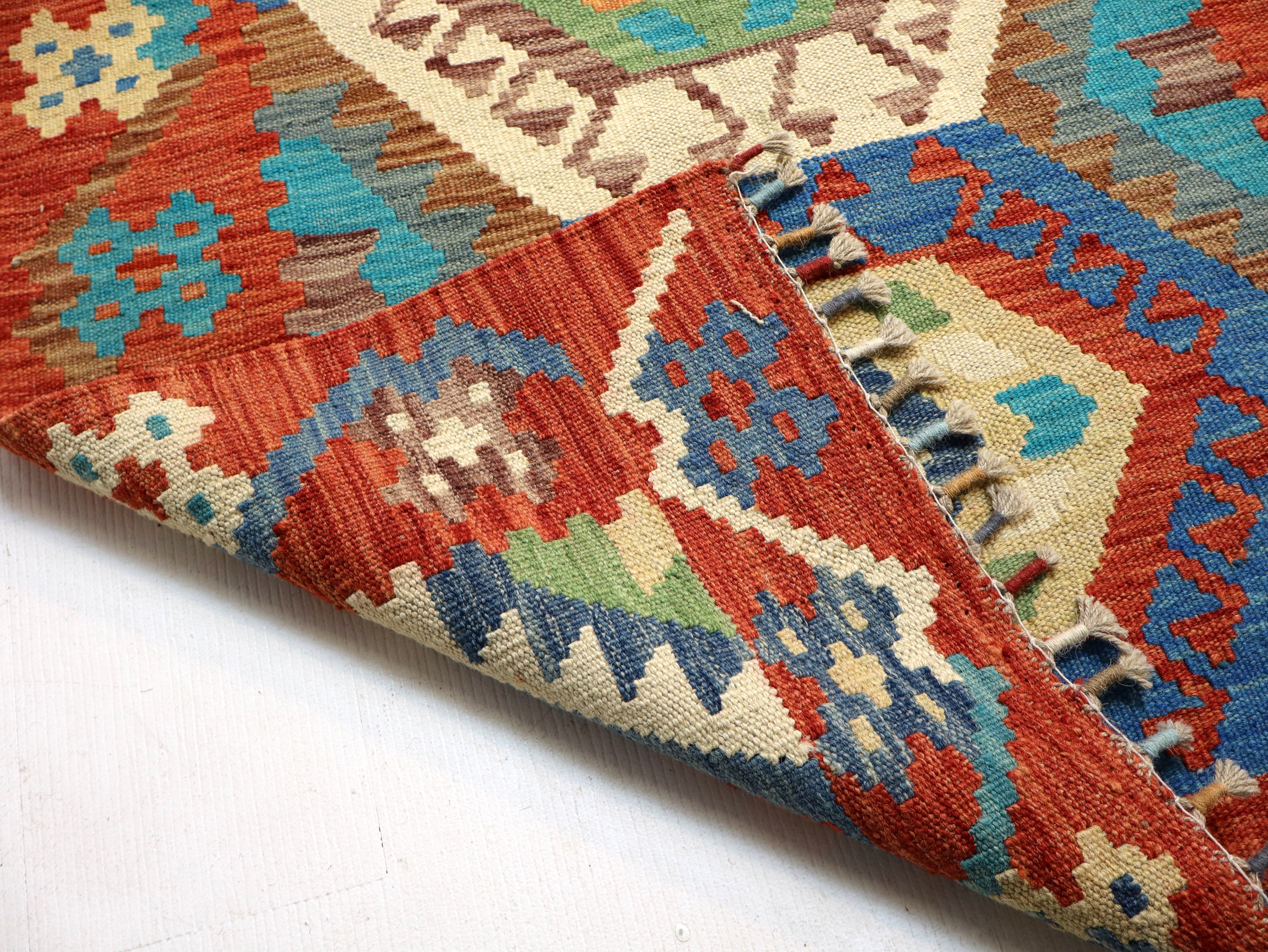 • Materials: Handwoven wool flatweave on a wool foundation