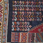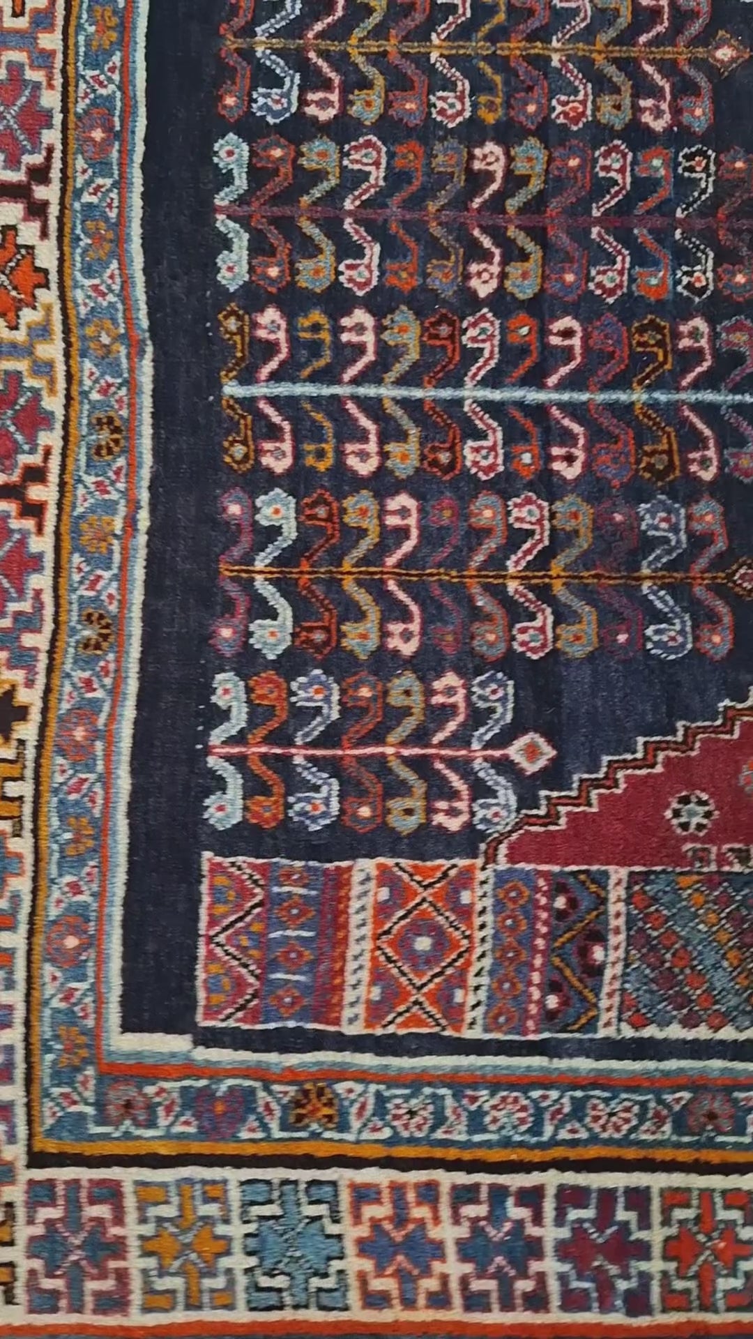 Along the border you’ll see the lively Qashqai palette, with joyful, saturated colours that are a hallmark of authentic Qashqai weaving. It is one of the clearest clues to this rug’s tribal origin and handmade character.