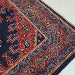 Smaller diamond-shaped medallion pendants extend from its top and bottom, creating the classic Viss arrangement of one primary medallion with two smaller finials. Flanking the center, you’ll notice angular hook motifs and serrated tribal ornaments in tomato-red stretching toward the field’s sides – these sharp geometric forms are a hallmark of Viss rugs. The four corners of the field hide tiny stylized animal figures – traditionally, Viss weavers include small mountain goats or rams in each corner as a nod to tribal folklore. These subtle corner motifs are an endearing hallmark of Vist village rugs, believed to symbolize strength and abundance in the weavers’ nomadic culture.